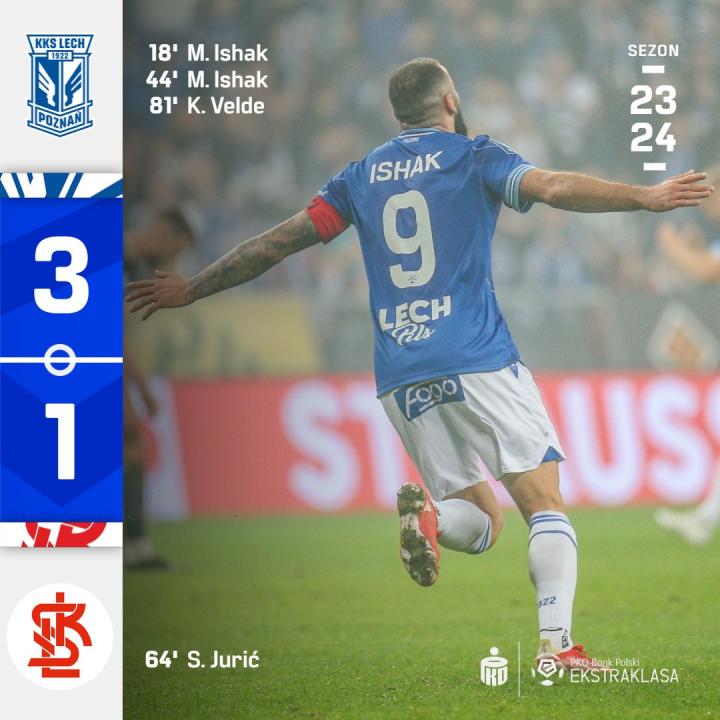 波兹南莱赫迎来联赛两连胜。第18分钟,伊沙克禁区边缘劲射破门。第44分钟,伊沙克再下一城完成没来二度。第64分钟,尤里奇为客队扳回一城。第81分钟,韦尔德抢点破门锁定胜局。