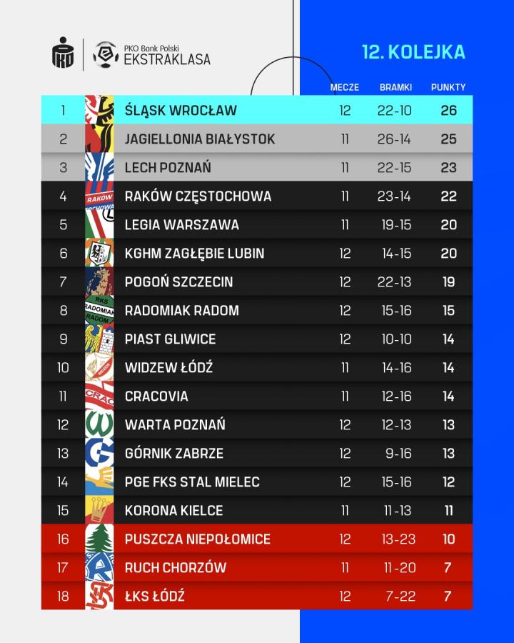 波兰足球资讯当地时间10月23日,波兰足球超级联赛第12轮的大部分比赛结束。雅盖隆完胜卢宾铜矿,波兰国脚弗多维克角球直接破门;克拉科维亚两球被吹,战平升班马涅波沃米采;弗罗茨瓦夫四球大胜华沙莱吉亚后领跑积分榜;伊沙克双响帮助波兹南莱赫战胜罗兹体育;横田大祐双响帮助扎布热矿工击败卫冕冠军琴斯托霍瓦。