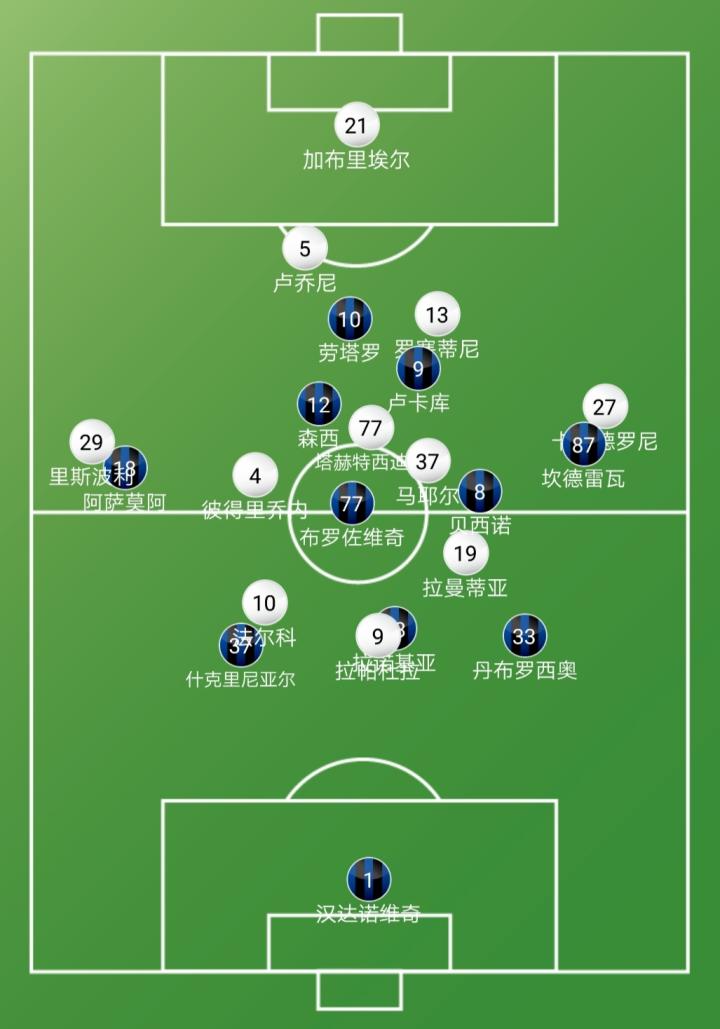 国际米兰的首发并没有太多意外,坎德雷瓦继续压制拉扎罗出任首发右翼卫,而左侧阿萨莫阿归队以后就没有了达尔伯特的位置,右中场的位置上贝西诺在竞争中胜过了新援巴雷拉。只有在拖后中卫的位置上,德弗赖赛前热身时身体不适,拉诺基亚顶替出场。