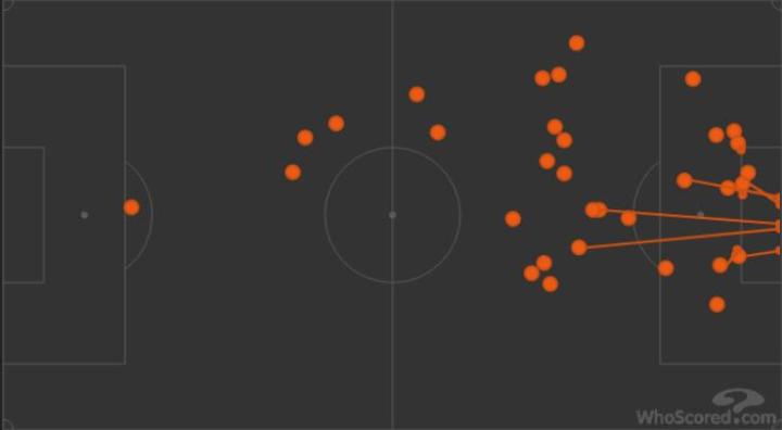 (图)本场卢卡库往30米区域传球起点