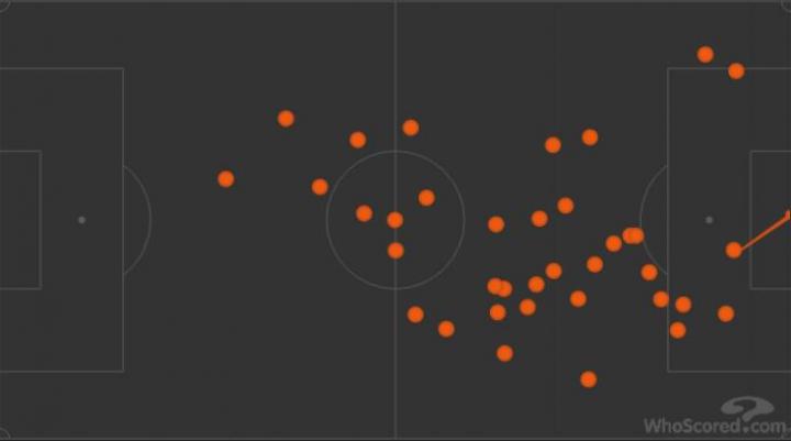 (图)本场比赛布罗佐维奇往30米区域内传球起点
