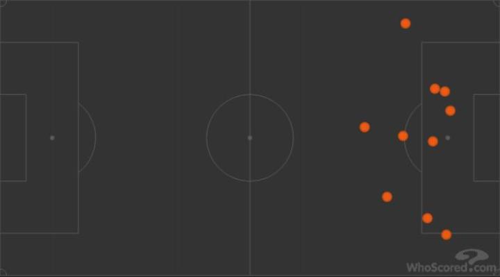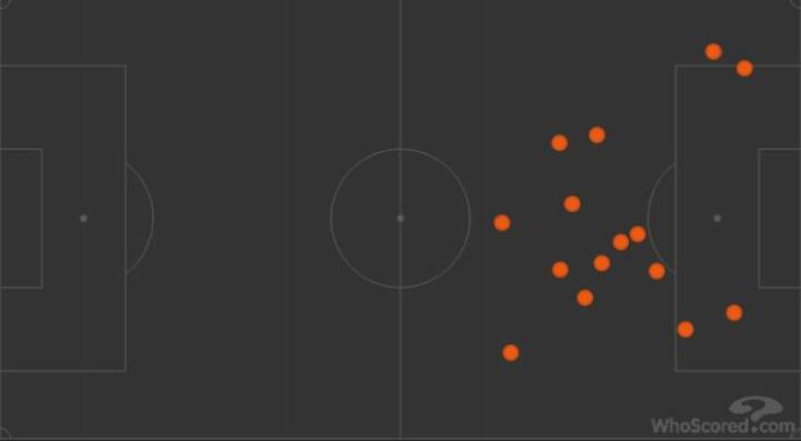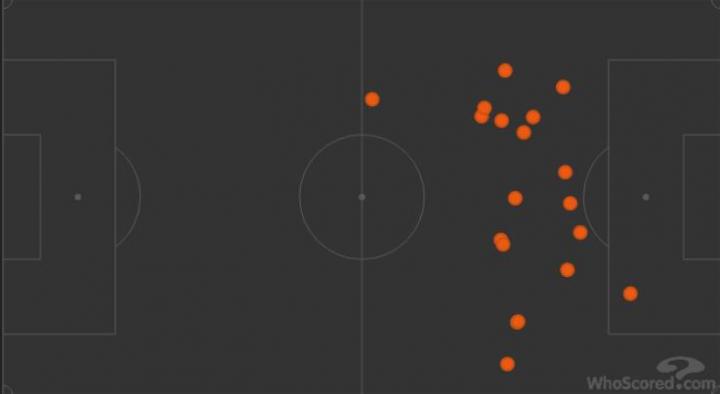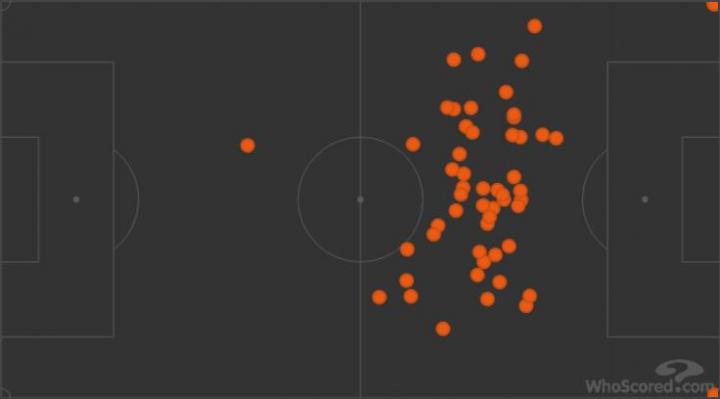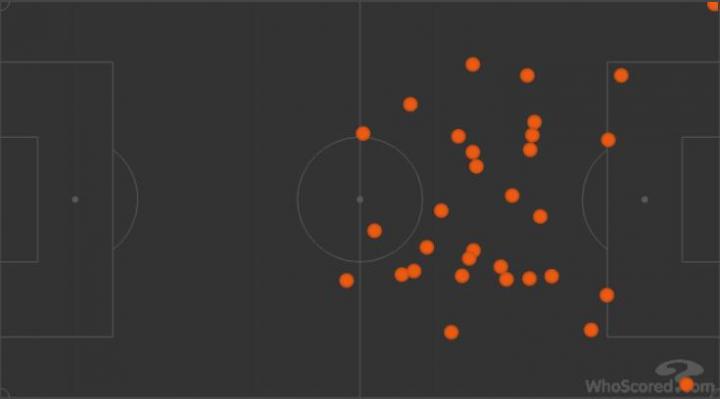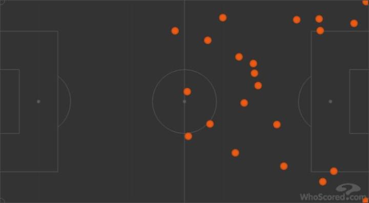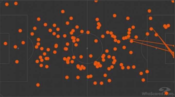 与上个赛季触球点全部集中在中圈靠后位置不同,本场布罗佐维奇的活动区域覆盖全场,跑动距离12.5公里冠绝全场,而两队其他球员加起来也只有两人跑动距离达到11公里,其他都在11公里以下。
