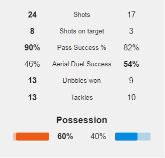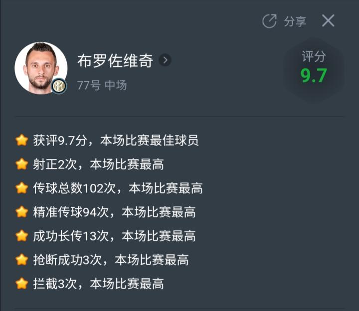 触球130次,领先第二名51次;传球104次,领先第二名41次,传球成功率高达92%;过人6次成功5次,全队第一;抢断5次成功3次,全场第一;成功拦截3次,全场并列第一;成功封堵3次,全场第二。这完全是掌控全场的统治级表现。