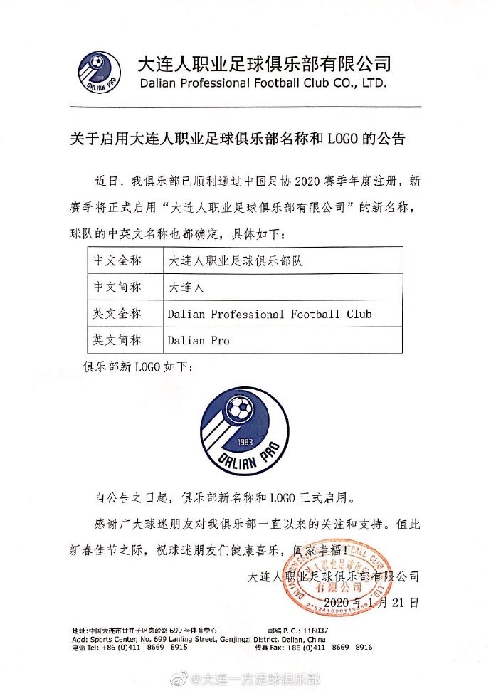 官方:大连一方发布新队徽,并正式更名为“大连人”Elix_wang @懂球帝2020-01-21 18:01大连一方官方宣布,球队将在新赛季正式启用“大连人职业足球俱乐部有限公司”的新名称,并公布了俱乐部新Logo。官方公告如下大连人职业足球俱乐部官方公告中表示,球队中文全名为“大连人职业足球俱乐部队”。中文简称“大连人”。英文全称为“Dalian Professional Football Club”,英文简称为“Dalian Pro”。大连人Logo展开更多