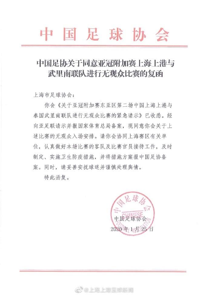 关于亚冠附加赛东亚区第二中国上海上港队与泰国武里南联队进无观众比赛的公告