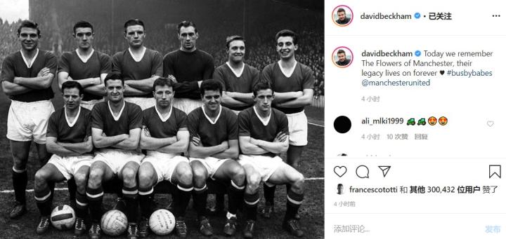 贝克汉姆在自己的Instagram上面写到:“今天,让我们纪念在慕尼黑空难中离世的人们,记住Flowers of Manchester,他们留下的遗产将永存世间。巴斯比宝贝。”,贝克汉姆还配上了一张当时那支曼联队的黑白合影,并且@ 了曼联官方Instagram。