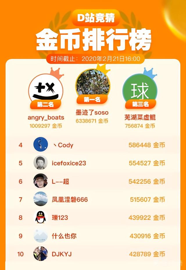 D站竞猜金币排行榜TOP10新鲜出炉!状元花落@墨迹了soso,目前已累计金币6338671,排行榜二三位的用户@angry_boats 、@芜湖菜虚鲲,分别已累计金币1009297和756874。在座的各位,你和第一名的差距隔了几个街口?(数据截止至2月21日16:00)