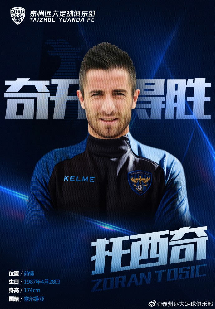 今天我们很高兴地宣布,塞尔维亚前国脚佐兰·托西奇正式与泰州远大足球俱乐部签约,我们期待这名履历显赫的球员,能够成为泰州远大的前场利剑。