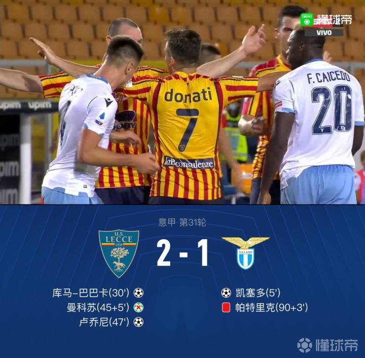 北京时间7月8日1:30,意甲联赛第31轮,“蓝鹰”拉齐奥奔赴客场,挑战“小辣椒”莱切。上半场,凯塞多破门,巴巴卡头球扳平,补时阶段帕特里克送点,但曼科苏没能打进,拉齐奥暂时1-1和莱切客场战平;下半场,卢乔尼头球破门,补时阶段帕特里克咬人染红,最终拉齐奥客场1-2不敌莱切,仍居意甲积分榜第二,距离尤文图斯有7分之差。