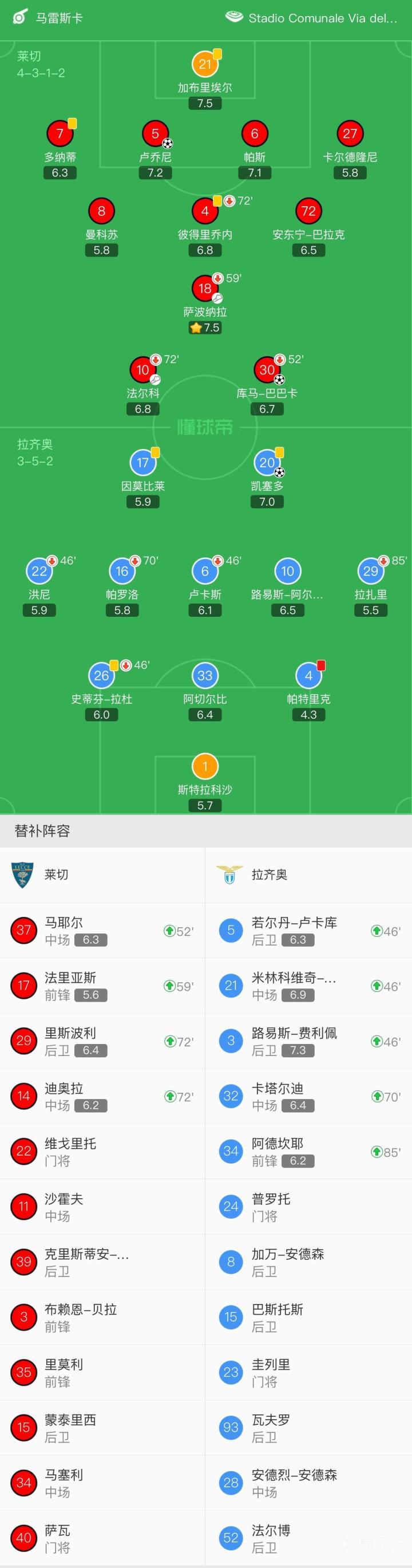 莱切首发:21-加布里埃尔、27-卡尔德隆尼、6-帕斯、5-卢乔尼、7-多纳蒂、72-安东宁-巴拉克、4-彼得里乔内(72' 14-迪奥拉)、8-曼科苏、18-萨波纳拉(59' 17-法里亚斯)、10-法尔科(72' 29-里斯波利)、30-库马-巴巴卡(52' 37-马耶尔);