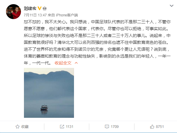 “中国足球队代表的不是那二三十人,不管你愿意不愿意,他们都代表这个国家,代表你。尽管你也可以拒绝,可事实如此。所以足球的惨淡与失败也绝不是那二三十人或者二三十万人的事儿。说起来,中国教育就很好吗?清华北大可以名列百强的排名也遮不住中国教育底色的苍白。进不了世界杯的无奈和得不到诺贝尔的无奈,究竟哪个更让人无语呢?说到底,体育的萎靡和教育的理念与功能性缺失,影响到的永远是我们的年轻人,一年一年,一代一代。”