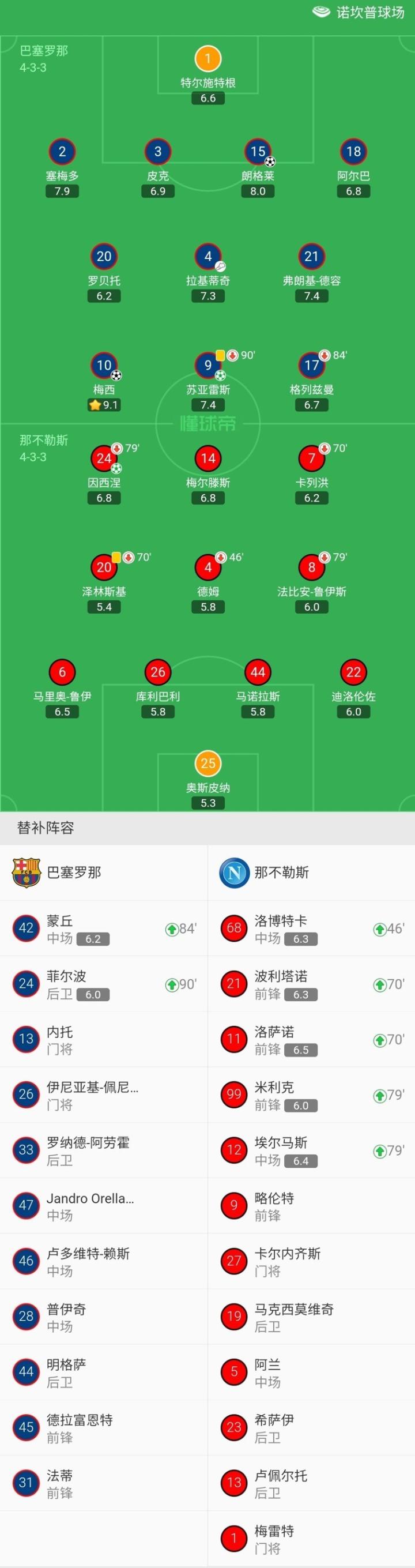 巴萨首发:1-特尔施特根、2-塞梅多、3-皮克、15-朗格莱、18-阿尔巴、20-罗伯托、4-拉基蒂奇、21-弗朗基-德容、10-梅西、9-苏亚雷斯(91`24-菲尔波)、17-格列兹曼(83`42-蒙丘)