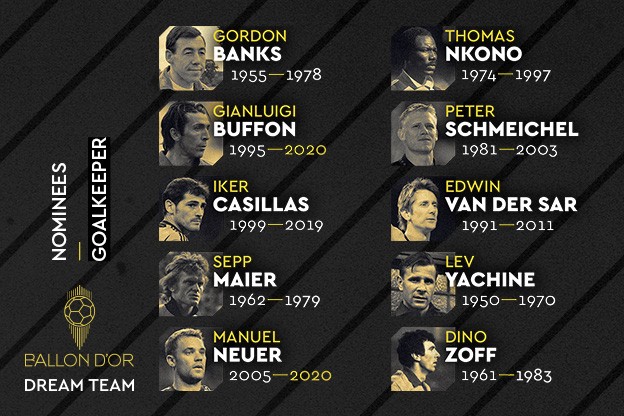 《法国足球》金球奖官方公布了“最佳11人”门将10人候选名单,现役门将布冯、诺伊尔入选,雅辛、佐夫和迈尔等多位传奇门将在列。