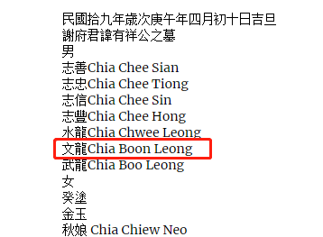 此时,谢家的六少爷谢文龙(Chia Boon Leong),才刚刚5岁。值得一提的是,这位在以后成长为新加坡足坛传奇的标志人物,却被大陆、香港和马来亚中文媒体长期搞错中文名,甚至包括当时中国队的《第十四届世界运动会中华代表团手册》中,也记录为谢文良。但根据谢有祥的墓碑显示,应为文龙。