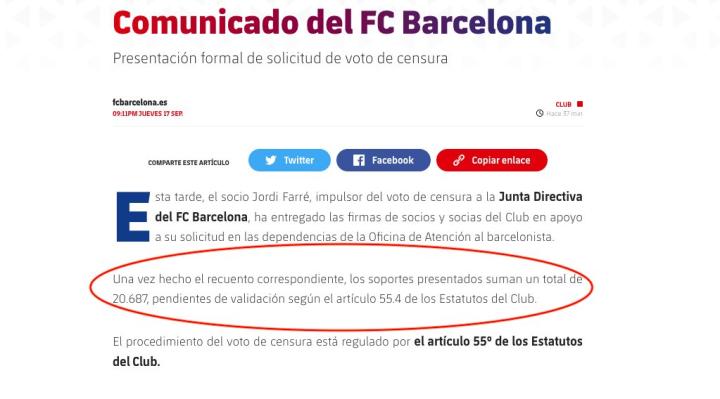 10月7号晚,弹劾活动发起者约尔迪-法雷宣布,弹劾动议的合格签名数已达到要求的16250。10月8号下午,在核验完全部20681份签名后,巴萨官方宣布,有19380张合格签名,已满足启动弹劾投票的要求。随后广大巴萨球迷便开始了漫长的等待,确定弹劾动议签名有效以后巴萨需要在10-20个工作日内举行弹劾投票,也就意味着11月2日是最终期限。