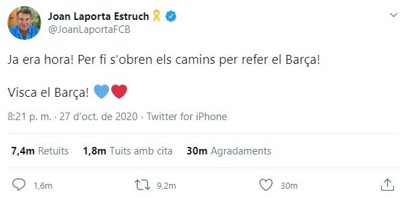 如果说有什么好消息能温暖一下巴萨球迷冰冷的心的话,那无疑便是拉波尔塔的表态了。巴托梅乌辞职的消息出来以后,拉波尔塔在推特上一席引人深思的话:“时候到了!重建巴萨之路终于开始了。巴萨万岁!”