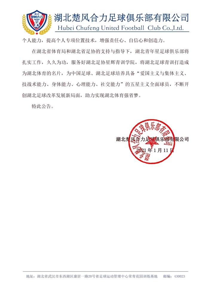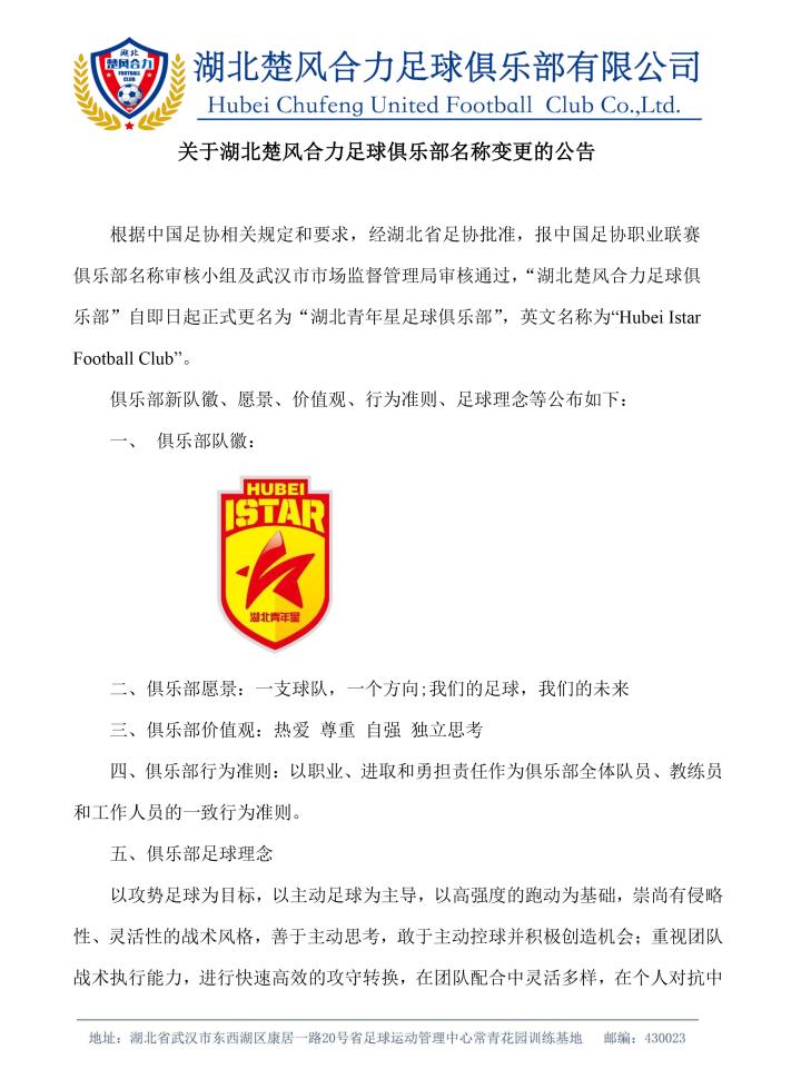 湖北楚风合力足球俱乐部根据中国足协相关规定和要求,经湖北省足协批准,报中国足协职业联赛俱乐部名称审核小组及武汉市市场监督管理局审核通过,“湖北楚风合力足球俱乐部”自即日起正式更名为“湖北青年星足球俱乐部”,英文名称为“Hubei Istar Football Club”。
