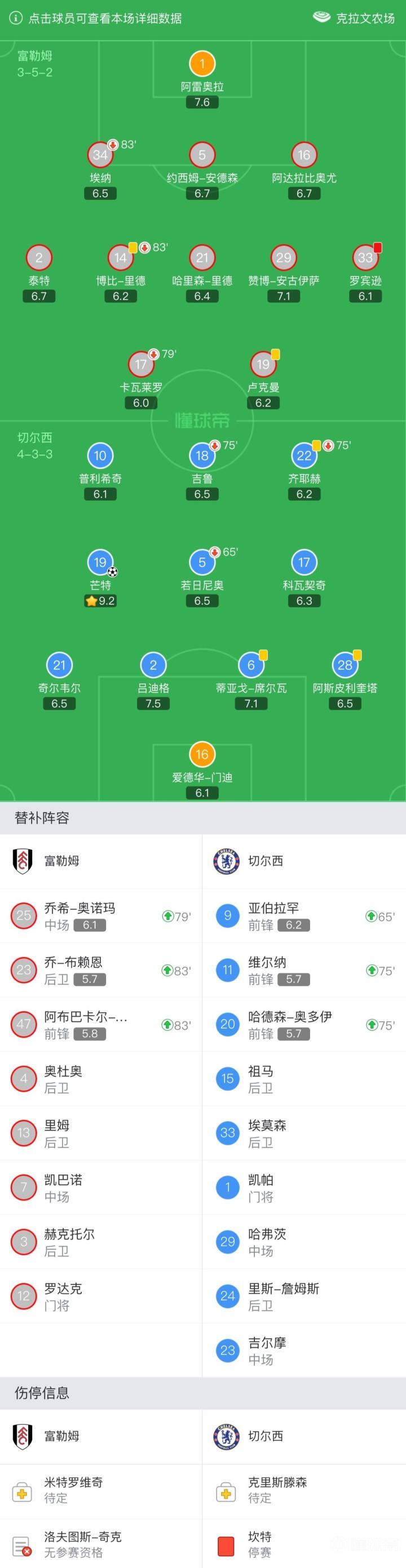 富勒姆首发:1-阿雷奥拉、34-埃纳(83' 23-乔-布赖恩)、5-约西姆-安德森、16-阿达拉比奥尤、2-泰特、14-博比-里德(83' 47-阿布巴卡尔-卡马拉)、21-哈里森-里德、29-赞博-安古伊萨、33-罗宾逊、17-卡瓦莱罗(80' 25-乔希-奥诺玛)、19-卢克曼;