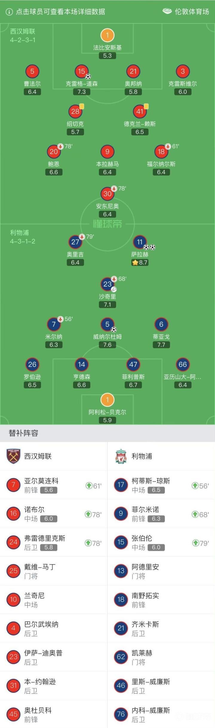 西汉姆联首发:1-法比安斯基、5-曹法尔、15-克雷格-道森、21-奥邦纳、3-克雷斯维尔、41-德克兰-赖斯、28-绍切克、18-福尔纳尔斯(61'7-亚尔莫连科)、20-鲍文(78'24-弗雷德里克斯)、9-本拉赫马、30-安东尼奥(78'16-诺布尔)