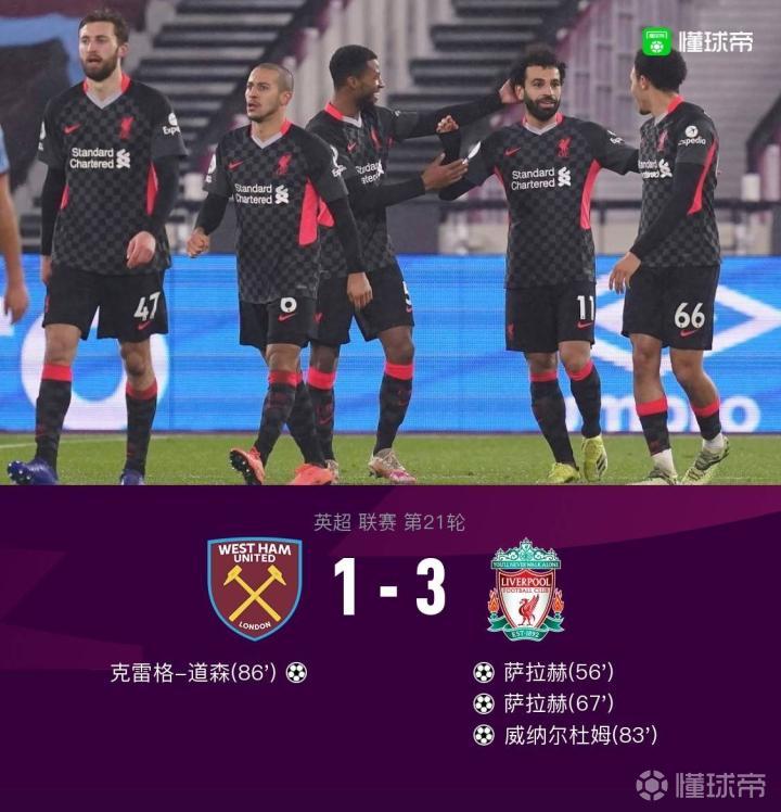 北京时间2月1日0:30,英超第21轮,利物浦客战西汉姆联。上半场双方互交白卷,易边再战,萨拉赫完成梅开二度,威纳尔杜姆锦上添花,道森扳回一球。最终全场比赛结束,利物浦3-1西汉姆联。