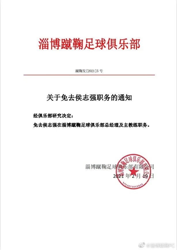 淄博蹴鞠官方:免去侯志强职务,任命朴徹为主帅