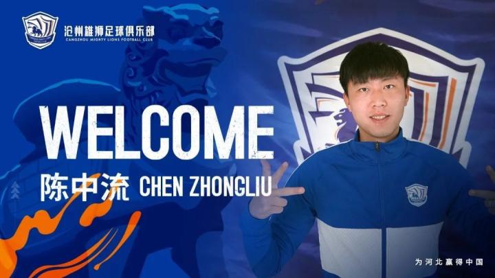 经友好协商,即日起陈中流正式加盟沧州雄狮足球俱乐部。