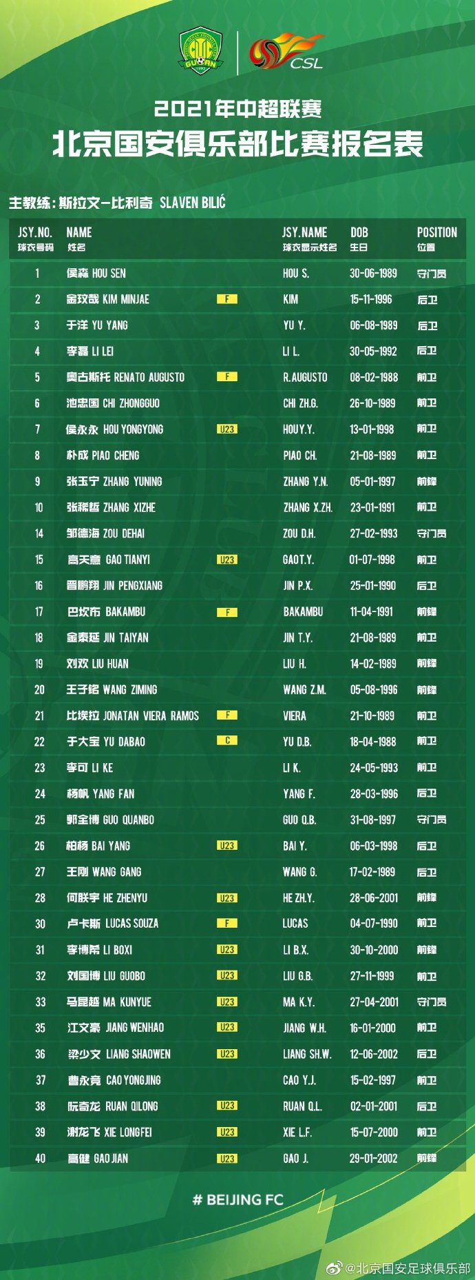 北京国安公布新赛季报名表,奥古斯托在列,无费尔南多。