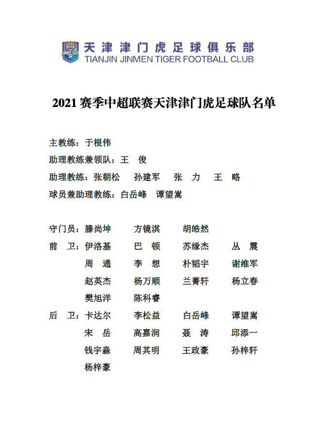 津门虎官宣大名单:伊洛基在列,白岳峰、谭望嵩兼任助教点赞狂魔0002021-04-14 15:044月14日,@天津津门虎FC 官宣新赛季大名单,伊洛基、巴顿在列,于根伟担任主帅,白岳峰、谭望嵩兼任助理教练。新赛季,天津津门虎与北京国安、上海海港、上海申花、河北队、大连人、长春亚泰以及武汉队同处苏州赛区。除了官宣大名单,天津津门虎也公布了球队新队徽。展开更多