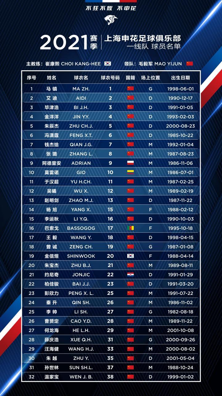 2021中超联赛上海申花球员名单