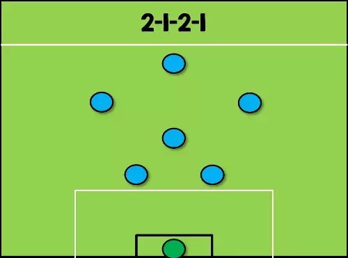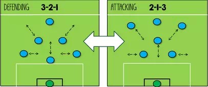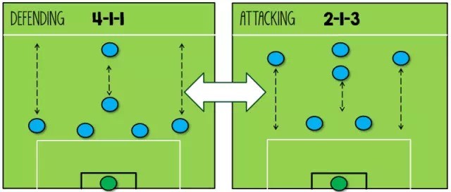 这个阵型转换其实就是2-1-2-1的攻防转换,其实这个时候的攻守转换都取决于一个点,那就是后腰这个位置的球员,由这名球员充当球队的攻守节拍器。其余两名中场球员也要有很强的奔跑能力,这样才能在攻守两端起到稳定攻守两端结构的作用(如果后腰退到后卫线而中场队员退不回来,那中场这个空档就留的太大了)。