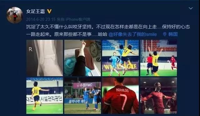 不过在韩国联赛踢球的王霜,成长经历并非一帆风顺,而拦路虎就是职业球员最头疼的伤病。有段时间,因为连续参加全运会、足协杯和国家队集训,王霜得了疲劳性骨裂。留洋韩国的后期,王霜经常是拄着拐在场边孤独的看着队友们训练、比赛,遥遥无期的归期,一度让王霜对于前途失去了希望。后来她曾在微博上说,这是运动生涯最困难的阶段。“不能训练不能比赛,语言也不通,当时可能让我坚持下来的原因一个是世青赛,第二个是梦想。”