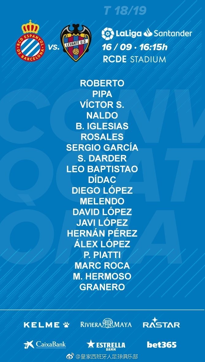 西班牙人VS莱万特比赛大名单,塞尔吉奥-加西亚反戈旧主